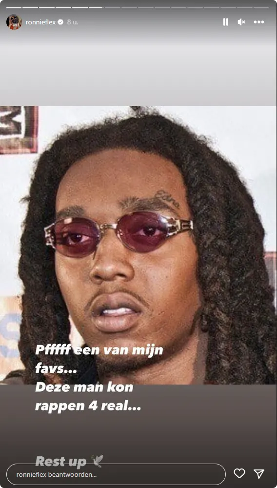 "pffff een van mijn favs...... Deze man kon rappen 4 real....Rest up." schrijft de rapper bij een foto van Takeoff. Naast deze story deelde Ronnie Flex ook nog een aantal nummers van Migos. De rapformatie die Takeoff vormde met rapper Quavo. Naast Ronnie Flex deelde ook rappers: Frenna, Boef en Gers Pardoel een eerbetoon aan de overleden Takeoff.