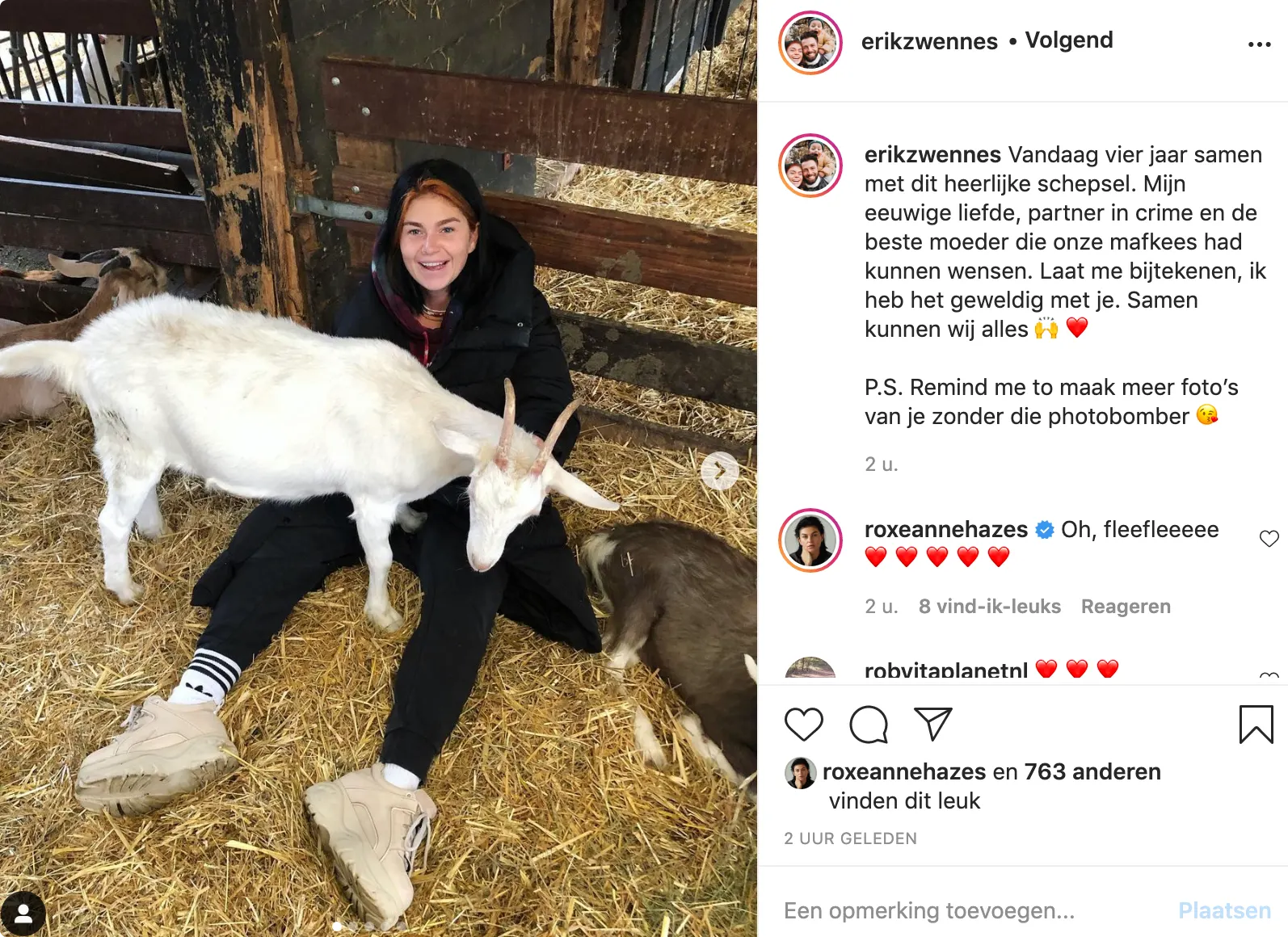 Op zijn Instagram-account laat hij verder weten: "Vandaag vier jaar samen met dit heerlijke schepsel. Mijn eeuwige liefde, partner in crime en de beste moeder die onze mafkees had kunnen wensen. Laat me bijtekenen, ik heb het geweldig met je. Samen kunnen wij alles." En Rox reageert: "Oh, fleefleeeee."