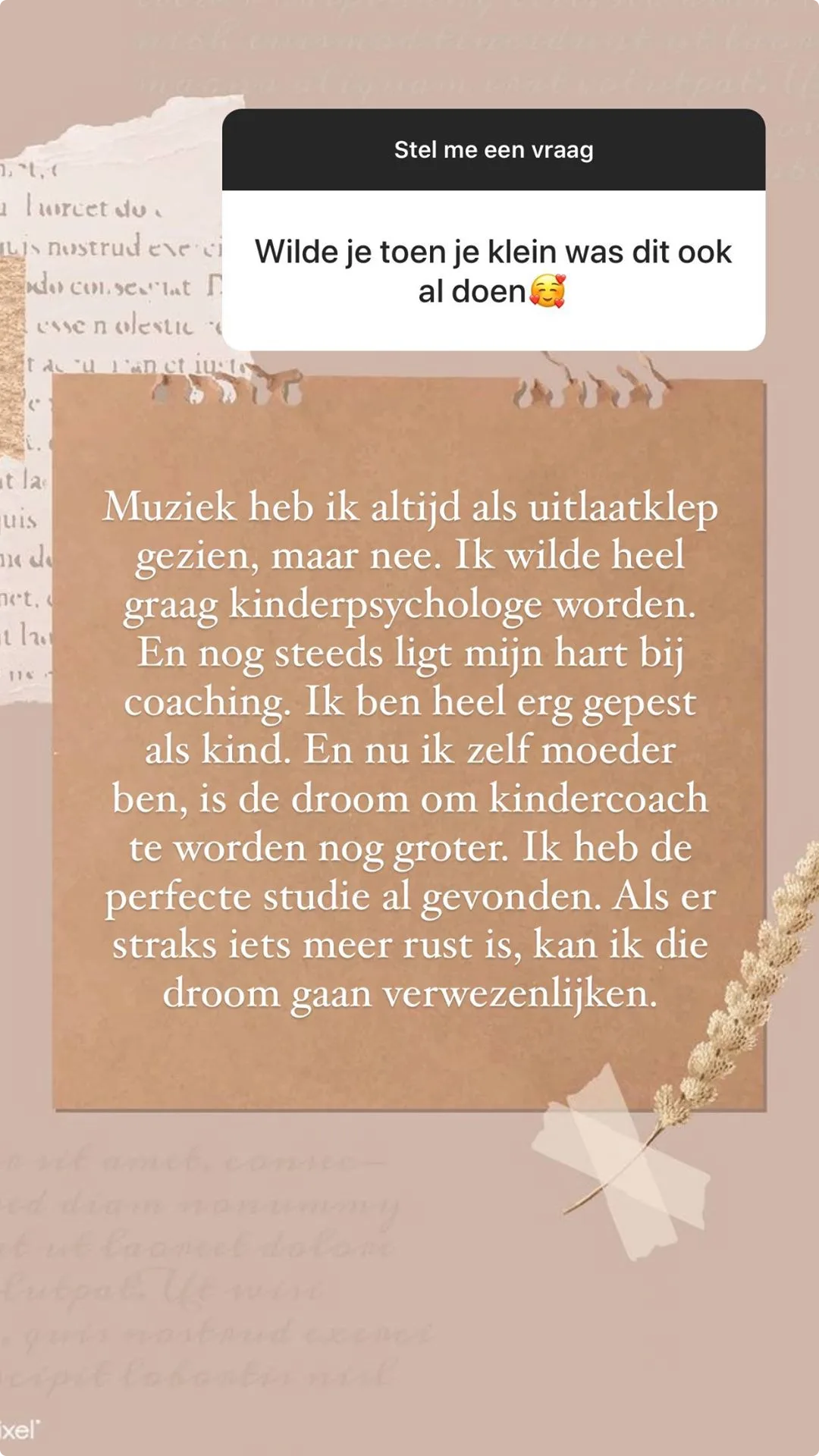 Nu ze zelf moeder is, is haar droom om kindercoach te zijn, alleen maar groter geworden. Volgens de zangeres heeft ze de perfectie studie al gevonden! Zodra er wat meer rust in haar leven is, wil ze deze droom gaan verwezenlijken.