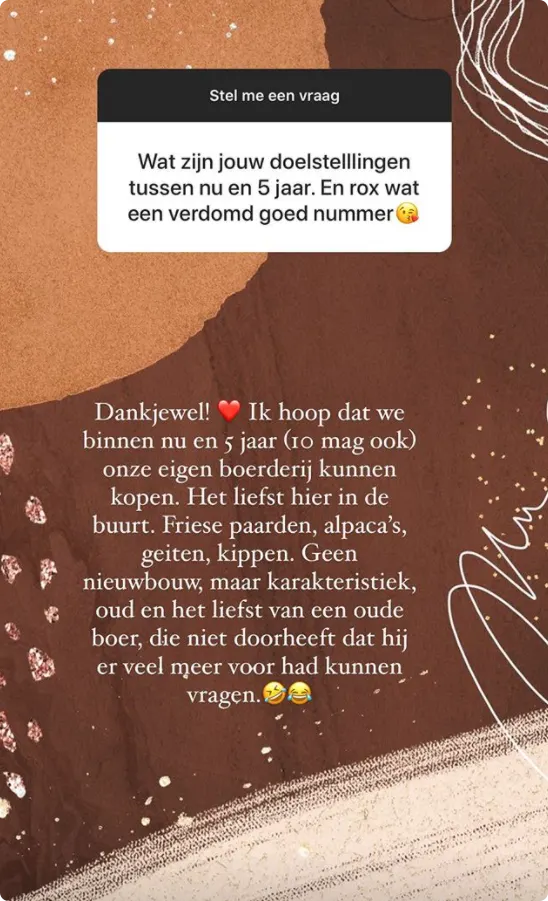 Een nieuwsgierige volger vraagt Roxeanne: "Wat zijn jouw doelstellingen tussen nu en 5 jaar?" De dochter van André Hazes onthult haar opvallende wens: "Ik hoop dat we binnen nu en 5 jaar (10 mag ook) onze eigen boerderij kunnen kopen. Het liefst hier in de buurt."