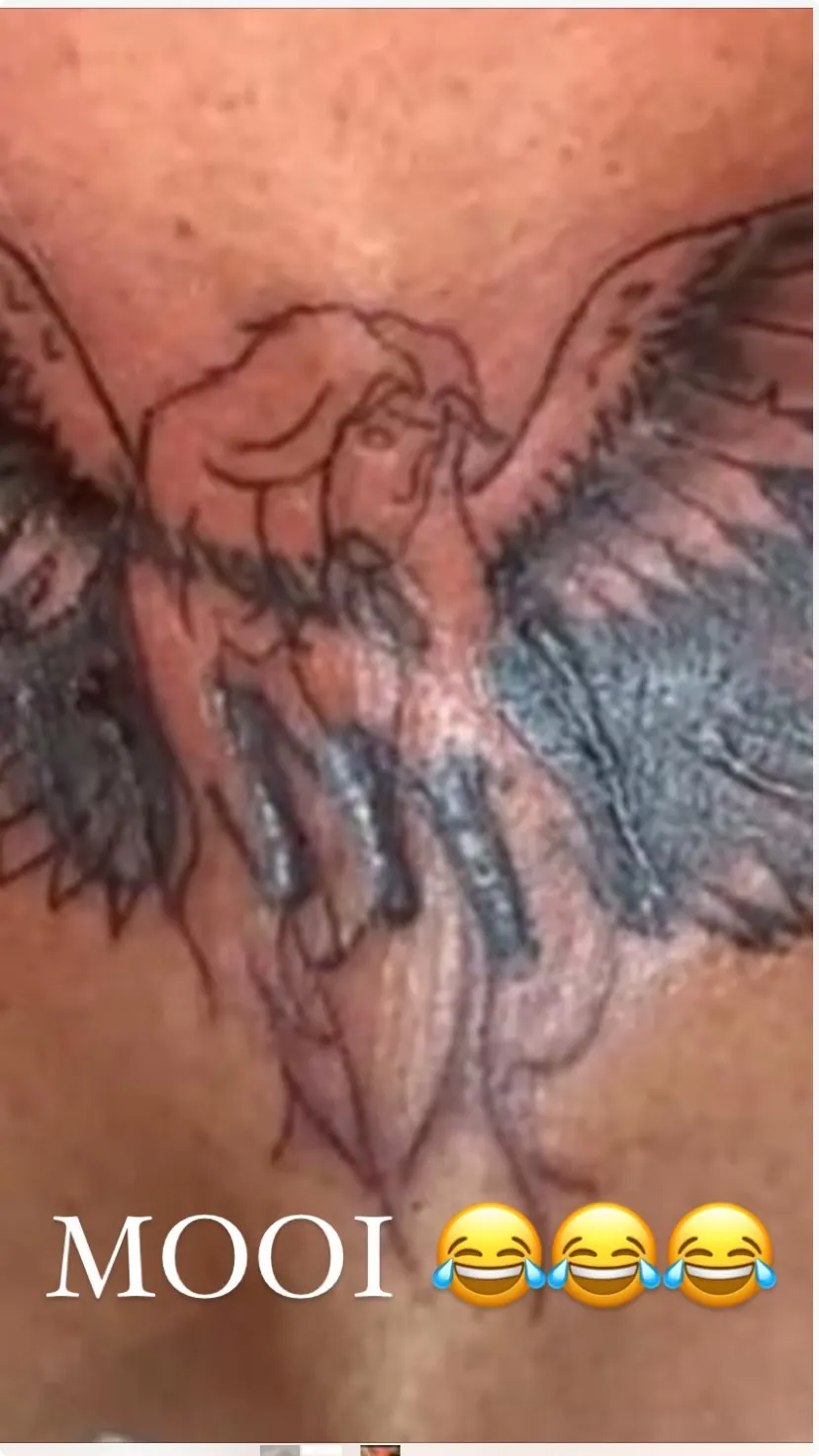 'Barbie' deelt een foto van haar nieuwe tattoo op Instagram. Een enorme engel prijkt op haar hals, op de plek waar eerst de naam van Gelmore stond. Zij laat op Instagram weten 'enorm blij te zijn met het resultaat'.