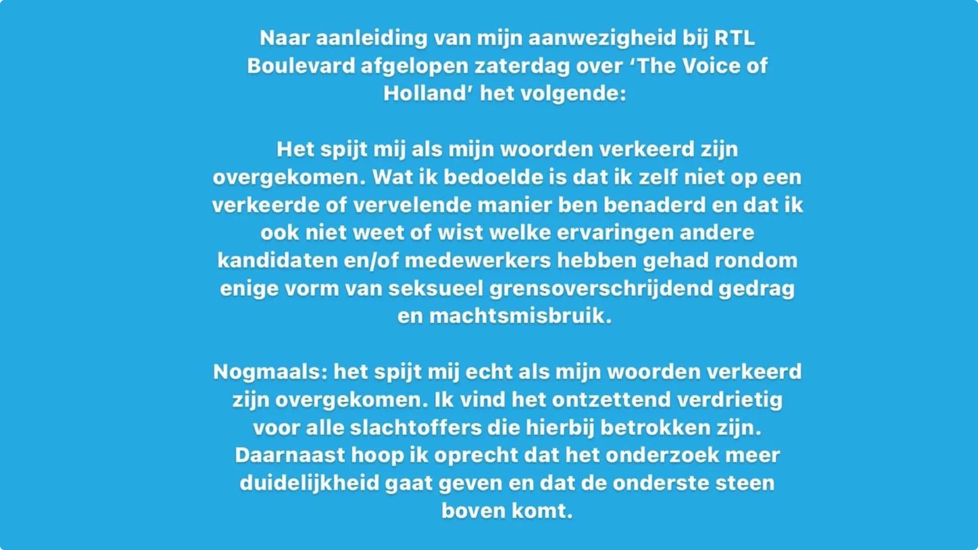 In RTL Boulevard zei de zangeres en oud-kandidate van het programma dat ze voormalig bandleider Jeroen Rietbergen "een topper en een retegoede muzikant" vindt en nooit iets heeft meegemaakt qua seksueel grensoverschrijdend gedrag. "Het spijt mij als mijn woorden verkeerd zijn overgekomen. Wat ik bedoelde is dat ik zelf niet op een verkeerde of vervelende manier ben benaderd en dat ik ook niet weet of wist welke ervaringen andere kandidaten en/of medewerkers hebben gehad rondom enige vorm van seksueel grensoverschrijdend gedrag en machtsmisbruik", schrijft Steenwijk op haar Instagram.