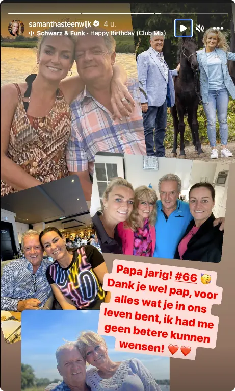 Samantha deelt in haar Instagram-story meerdere foto's van haar vader. Bij de foto's schrijft ze: "Papa jarig! #66 Dankjewel pap, voor alles wat je in ons leven bent, ik had me geen betere kunnen wensen."