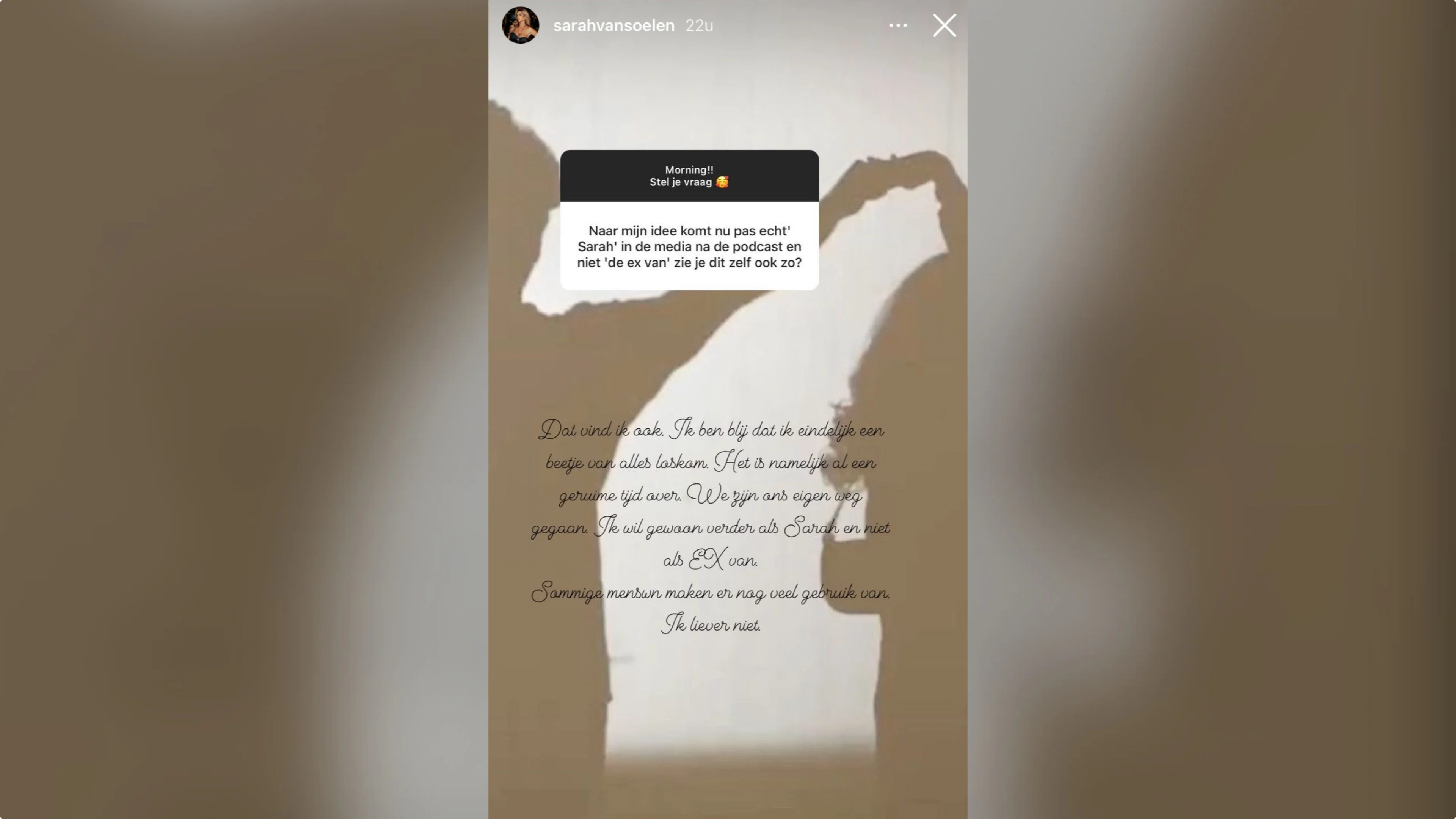 Een Instagramvolger van Sarah vindt dat een goede zet en vraagt: "Naar mijn idee komt nu pas echt Sarah in de media na de podcast en niet 'de ex van' Zie je dit zelf ook zo?" Sarah is het daar helemaal mee eens. Het is tenslotte al geruime tijd over tussen haar André, vindt ze. "We zijn onze eigen weg gegaan. Ik wil gewoon verder als Sarah en niet als 'ex van'. Sommige mensen maken er nog veel gebruik van. Ik liever niet."