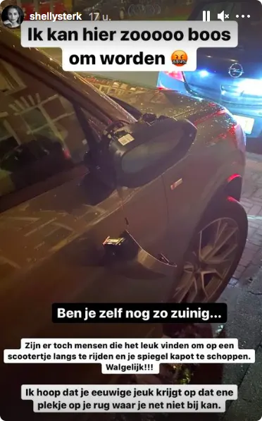 Zo deelt ze een foto van de schade en schrijft: "Ik kan hier zo boos om worden". Op de foto is te zien dat de spiegel van de auto is vernield. "Ben je zelf nog zo zuinig... Zijn er toch mensen die het leuk vinden om op hun scootertje langs te rijden en je spiegel kapot te trappen. Walgelijk!"