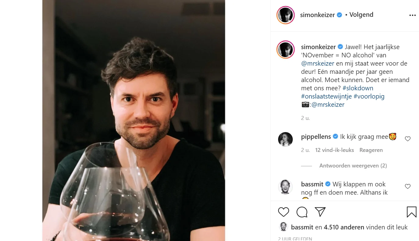 "Eén maandje per jaar geen alcohol", verduidelijkt Simon de uitdaging. "Moet kunnen. Doet er iemand met ons mee?" In de hashtags schrijft hij dat het wijntje op de foto dus voorlopig zijn laatste wijntje is in deze 'slokdown'.