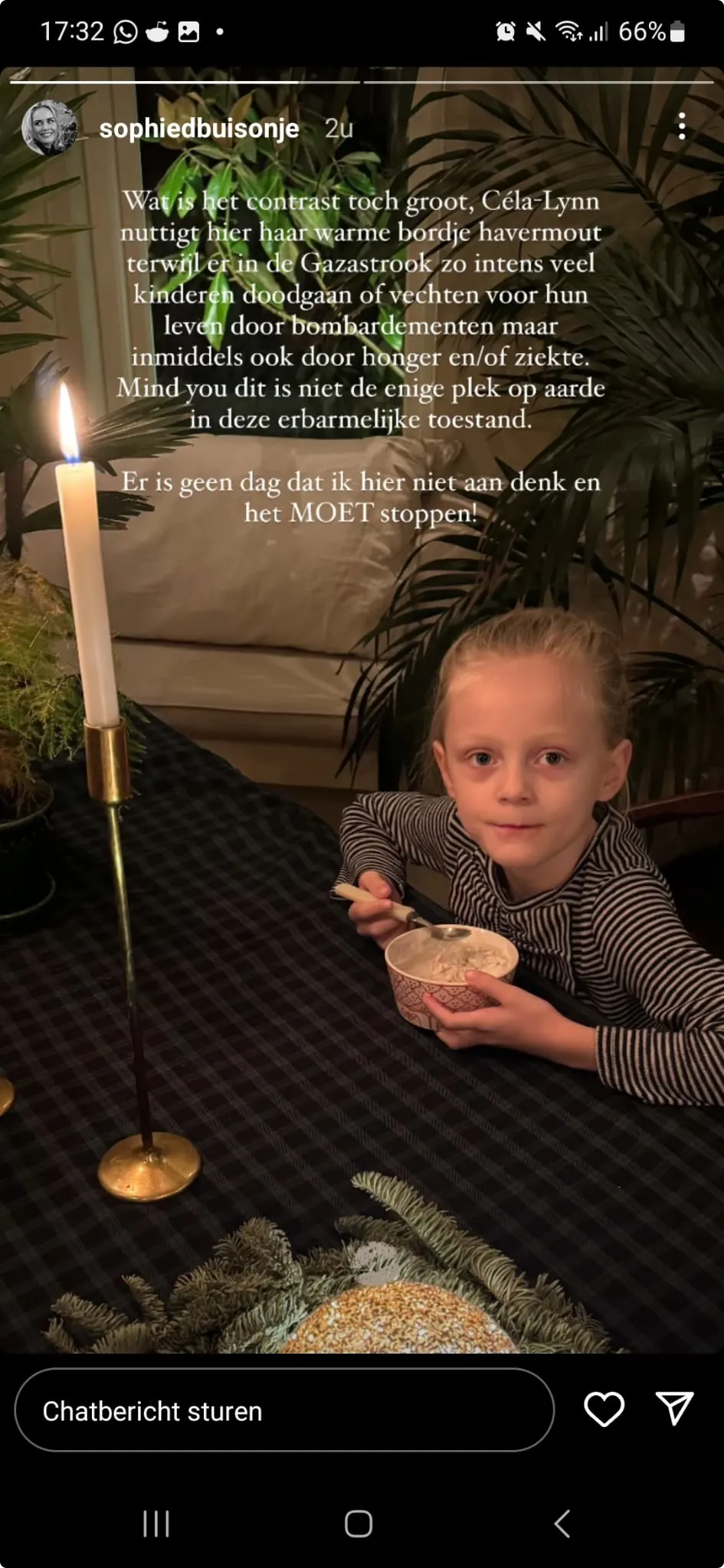 "Wat is het contrast toch groot.", begint ze haar verhaal. Op de foto zie je haar dochter met een bakje havermout poseren. "Terwijl er in de Gazastrook zo intens veel kinderen dood gaan of vechten voor hun leven door bombardementen.", schrijft de vrouw van Xander. Sophie laat weten dat er geen dag voorbij gaat dat ze niet aan dit incident denkt. "Het MOET stoppen!"
