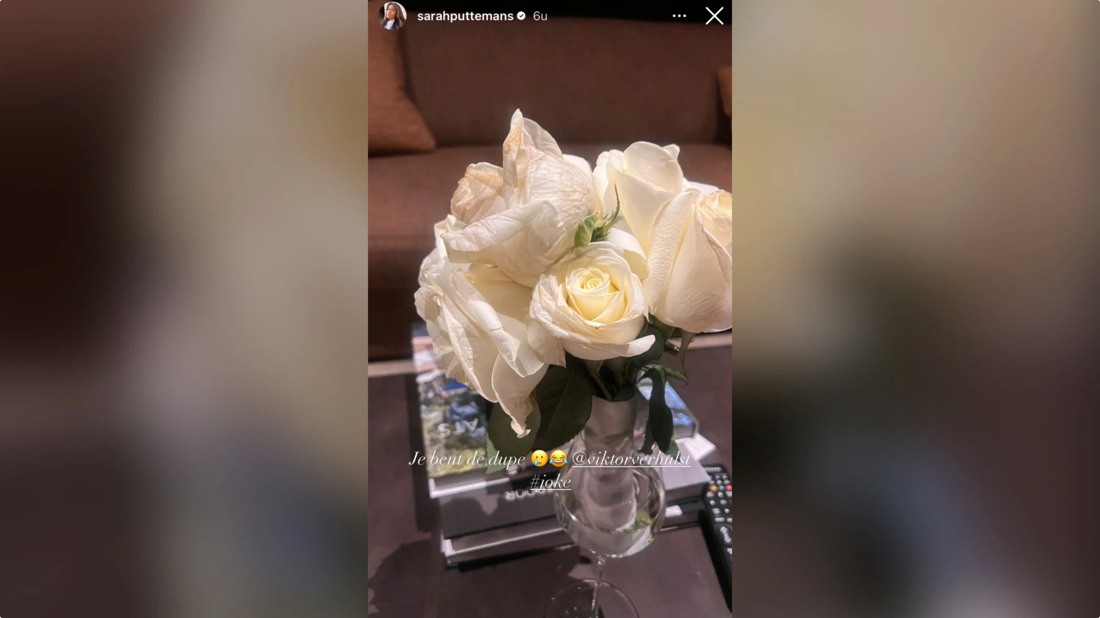 Vol trots deelt Sarah de gevangen rozen op haar Instagram. Gekscherend schrijft ze erbij: "Je bent de dupe Viktor." Toch lijkt het stel nog geen serieuze trouwplannen te hebben, want bij de foto zet ze ook de hashtag 'joke'.