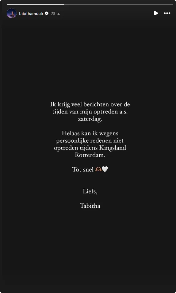 "Ik krijg veel berichten over de tijden van mijn optreden aanstaande zaterdag. Helaas kan ik wegens persoonlijke redenen niet optreden tijdens Kingsland Rotterdam. Tot snel. Liefs, Tabitha", schrijft de zangeres.