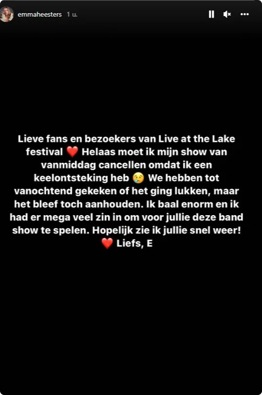 "Lieve fans en bezoekers van Live at the Lake Festival", begint Heesters haar bericht. "Helaas moet ik mijn show van vanmiddag cancellen omdat ik een keelontsteking heb. We hebben tot vanochtend gekeken of het ging lukken, maar het bleef toch aanhouden. Ik baal enorm en ik had er mega veel zin in om voor jullie deze show te spelen. Hopelijk zie ik jullie snel weer!"