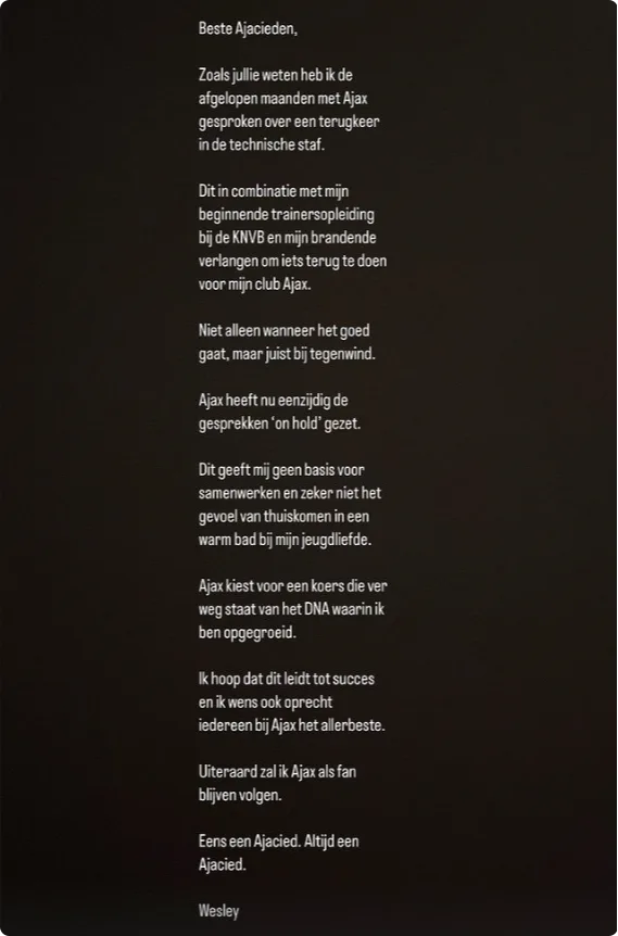 De trainer van Ajax liet voor de camera van ESPN weten dat hij nog altijd openstaat voor een samenwerking met de recordinternational van Oranje. "Wesley wil zich volledig storten op het trainersvak en zijn diploma’s gaan halen. Ik vind dat we dat soort spelers een podium moeten geven. We komen er bij hem op terug, absoluut. En kijken dan in welke vorm we het gaan gieten."