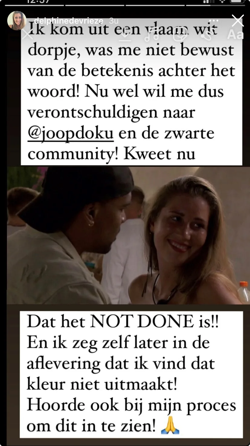 Zo schrijft ze: "Ik was me niet bewust van het woord. Nu wel, wil ik me dus verontschuldigen naar Joop en de zwarte community. Ik weet nu dat het not done is. Ik zeg later in de aflevering ... ''