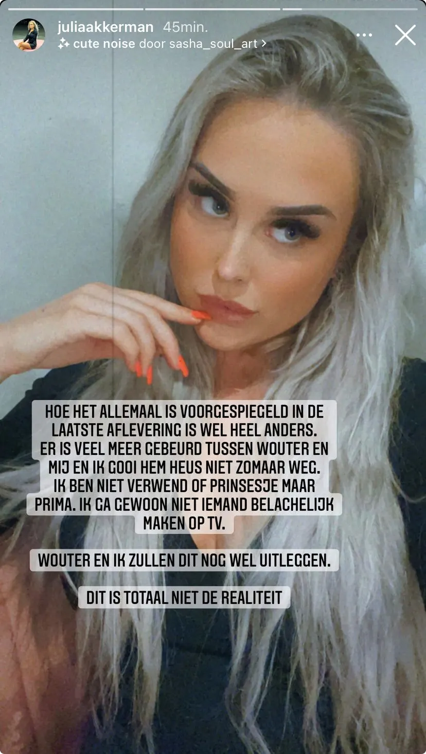 ''Hoe het allemaal is voorgespiegeld in de laatste aflevering is wel heel anders'', aldus Julia. ''Er is veel meer gebeurd tussen Wouter en mij en ik gooi hem heus niet zomaar weg.'' Ze laat verder weten dat ze Wouter niet belachelijk wilde maken op televisie. ''Ik ben niet verwend of prinsesje maar prima. Ik ga gewoon niet iemand belachelijk maken op TV. Wouter en ik zullen dit nog wel uitleggen, dit is totaal niet de realiteit.''