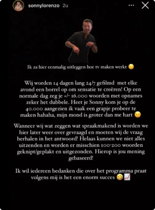 Sonny wil daar graag op reageren. De spraakmakende en spraakzame deelnemer gaat op social media los in een post. “Ik zal hier eenmalig uitleggen hoe tv maken werkt”, schrijft hij op Instagram.