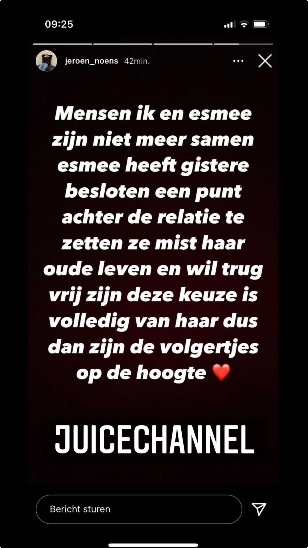 Haar ex, Jeroen, maakt de breuk bekend via zijn Instagram Stories, waarvan een screenshot gedeeld wordt door Juicechannel. "Mensen, ik en Esmee zijn niet meer samen", begint hij zijn bericht. Hij onthult dat zij degene is die de relatie verbrak. "Esmee heeft gister besloten een punt achter de relatie te zetten. Ze mist haar oude leven en wil terug vrij zijn. Deze keuze is volledig van haar dus dan zijn de volgertjes op de hoogte", schrijft Jeroen.