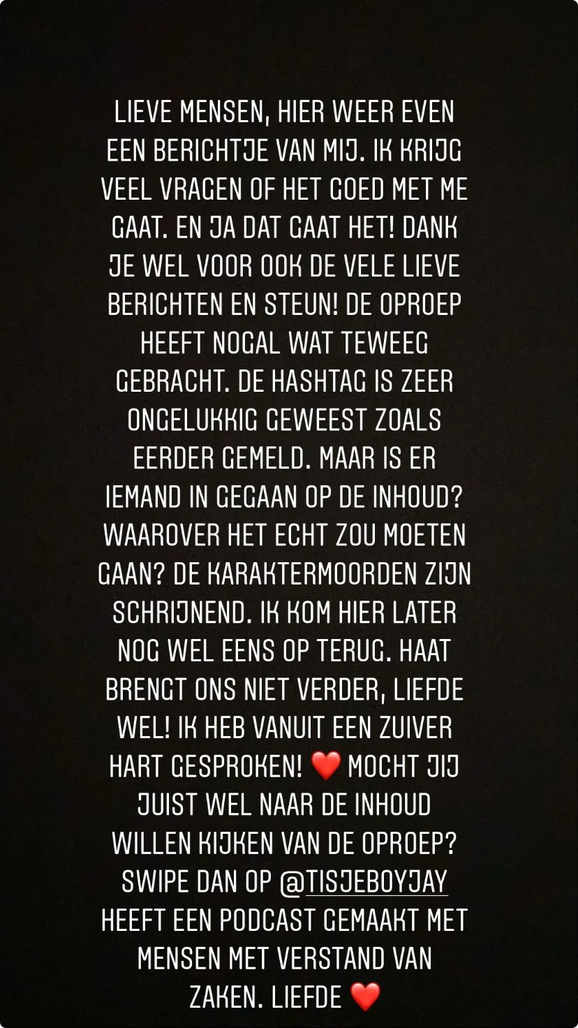 Vervolgens schrijft Tim dat hij vindt dat er karaktermoord is gepleegd. "De karaktermoorden zijn schrijnend. Ik kom hier later nog wel eens op terug. Haat brengt ons niet verder, liefde wel! Ik heb vanuit een zuiver hart gesproken!" Het hele bericht is hieronder terug te lezen.