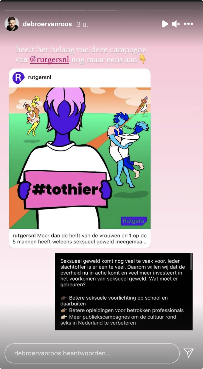 Ook vindt hij dat er meer actie moet worden ondernomen: "Betere seksuele voorlichting op school en daarbuiten. Betere opleidingen voor betrokken professionals en meer publiekscampagnes om de cultuur rond seks in Nederland te verbeteren", deelt Tim op Instagram.