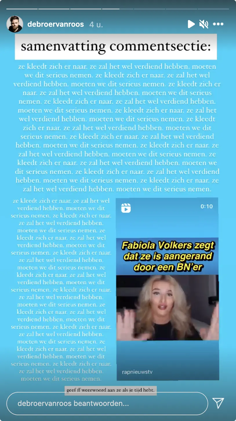 Tim Hofman heeft de reacties ook gelezen en neemt het voor haar op. "Ze kleedt zich er naar. Ze zal het wel verdiend hebben. Moeten we dit serieus nemen?", schrijft hij tientallen keren bij een post op zijn social media. Hij roept zijn volgers dan ook op een reactie met tegengeluid te plaatsen: "Geef even weerwoord aan ze als je tijd hebt."
