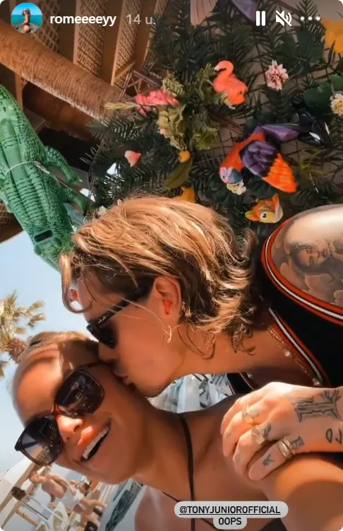 Op Instagram Stories deelt Romée, die furore maakte in Temptation Island 2020, beelden met Tony Junior. "Oeps", schrijft ze bij de beelden, waarop Tony zegt 'eehm' en haar volgens een zoen op de wang geeft.