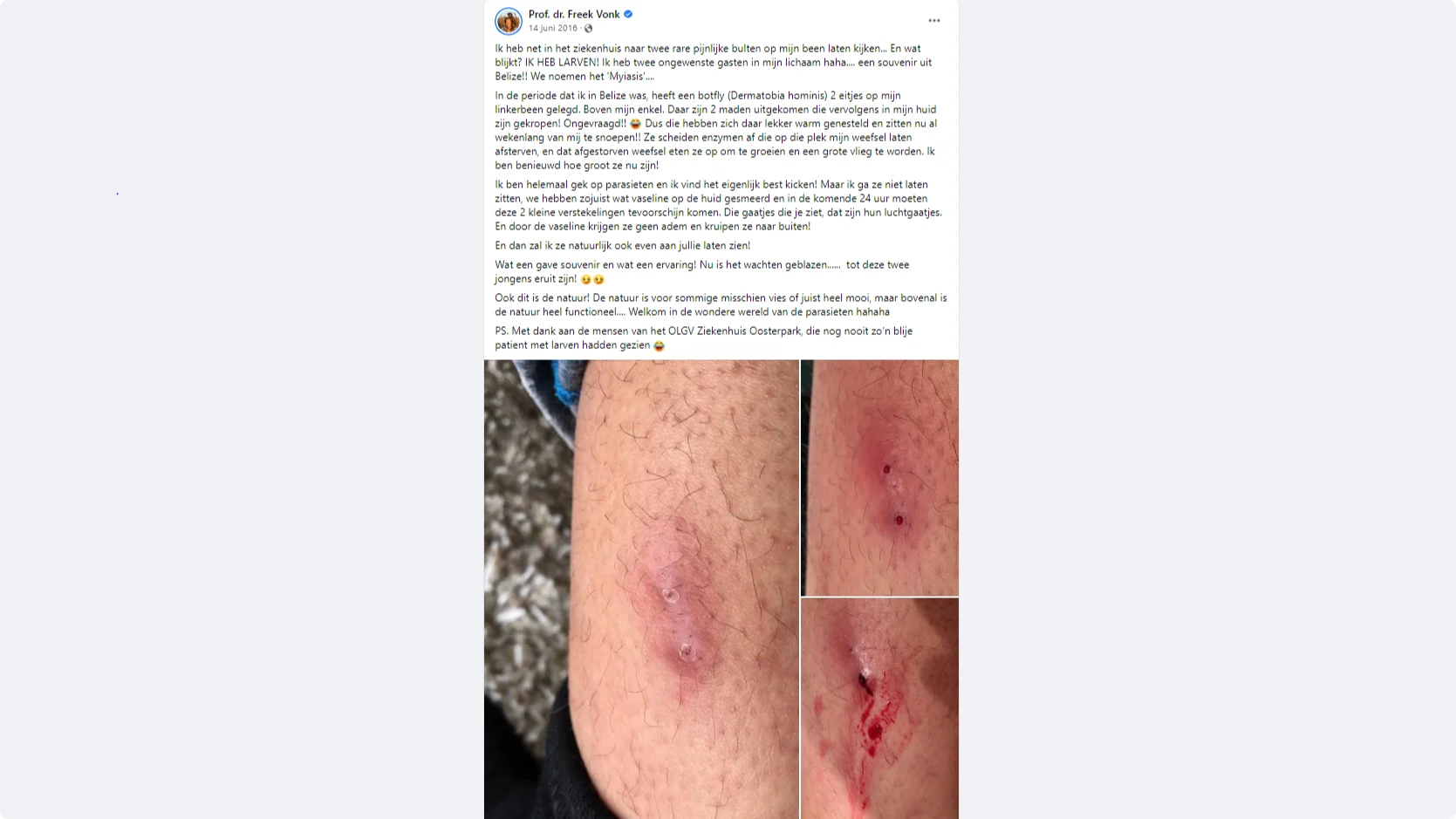 Maar het lijkt er toch op dat de bioloog weer een parasiet in zijn lichaam heeft en dat zou dan niet voor het eerst zijn. In 2016 werd de bioloog verlost van drie larven in zijn been. Tijdens zijn reis naar Belize had de botfly (Dermatobia hominis) eitjes op zijn linkerbeen gelegd en daar waren na zijn thuiskomst in Nederland drie maden uitgekropen: