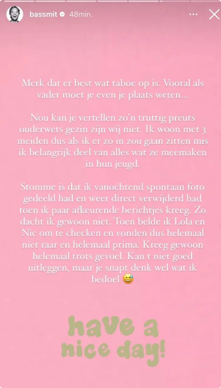 Bas merkt dat er een taboe op heerst. "Vooral als vader moet je even je plaats weten.. Nou, ik kan je vertellen zo’n truttig, preuts, ouderwets gezin zijn wij niet. Ik woon met drie meiden dus als ik er zo in zou gaan zitten mis ik een belangrijk deel van alles wat ze meemaken in hun jeugd. Het stomme is dat ik vanochtend spontaan foto gedeeld had en weer direct verwijderd had toen ik een paar afkeurende berichtjes kreeg. Toen belde ik Lola en Nic om te checken en zij vonden het dus helemaal niet raar en helemaal prima."