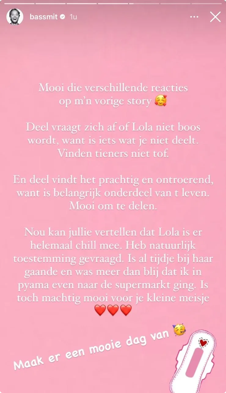 "Girl dad", schreef Bas, die vervolgens een enorme lading reacties in zijn DM kreeg. "Een deel vraagt zich af of Lola niet boos wordt, want het is iets wat je niet deelt. Vinden tieners niet tof." Er zijn echter ook mensen die er heel anders tegenaan kijken. "Een deel vindt het prachtig en ontroerend, want het is een belangrijk onderdeel van het leven. Mooi om te delen."