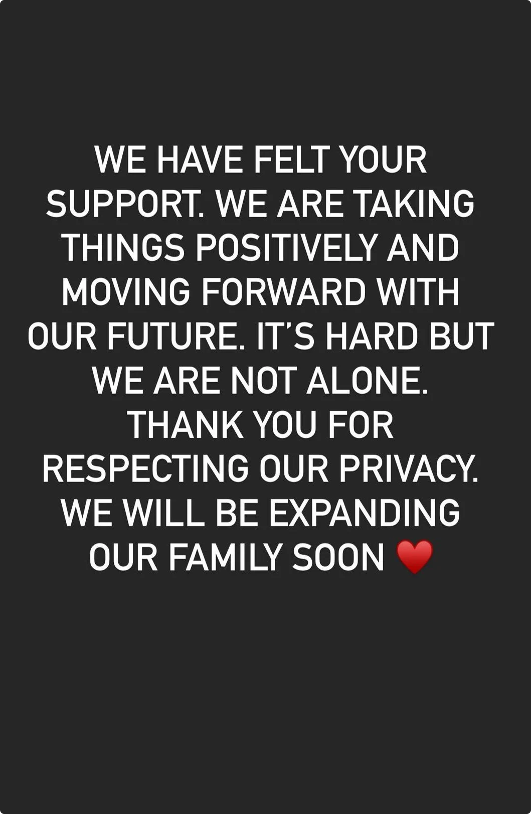 In hun verklaring van zaterdag lieten de twee al weten het te blijven proberen. "We zullen ons gezin snel uitbreiden", herhaalt de acteur nu.