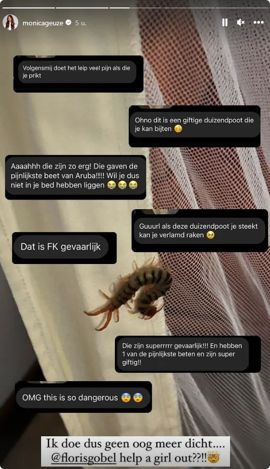 Zo schrijven verschillende volgers dat het insect een giftige duizendpoot is. Zo schrijft iemand: "Girl, als deze duizendpoot je steekt kan je verlamd raken" en schrijft een ander: "Ah die zijn zo erg! Die gaven de pijnlijkste beet van Aruba!!! Wil je dus niet in je bed hebben liggen."