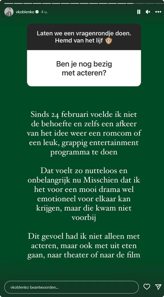 Victoria Koblenko pakt momenteel niet alle acteerklussen aan. De actrice van Oekraïense komaf voelt sinds de oorlog in Oekraïne "niet de behoefte en zelfs een afkeer van het idee weer een romcom of een leuk, grappig entertainmentprogramma te doen." Dat schrijft Koblenko op Instagram.