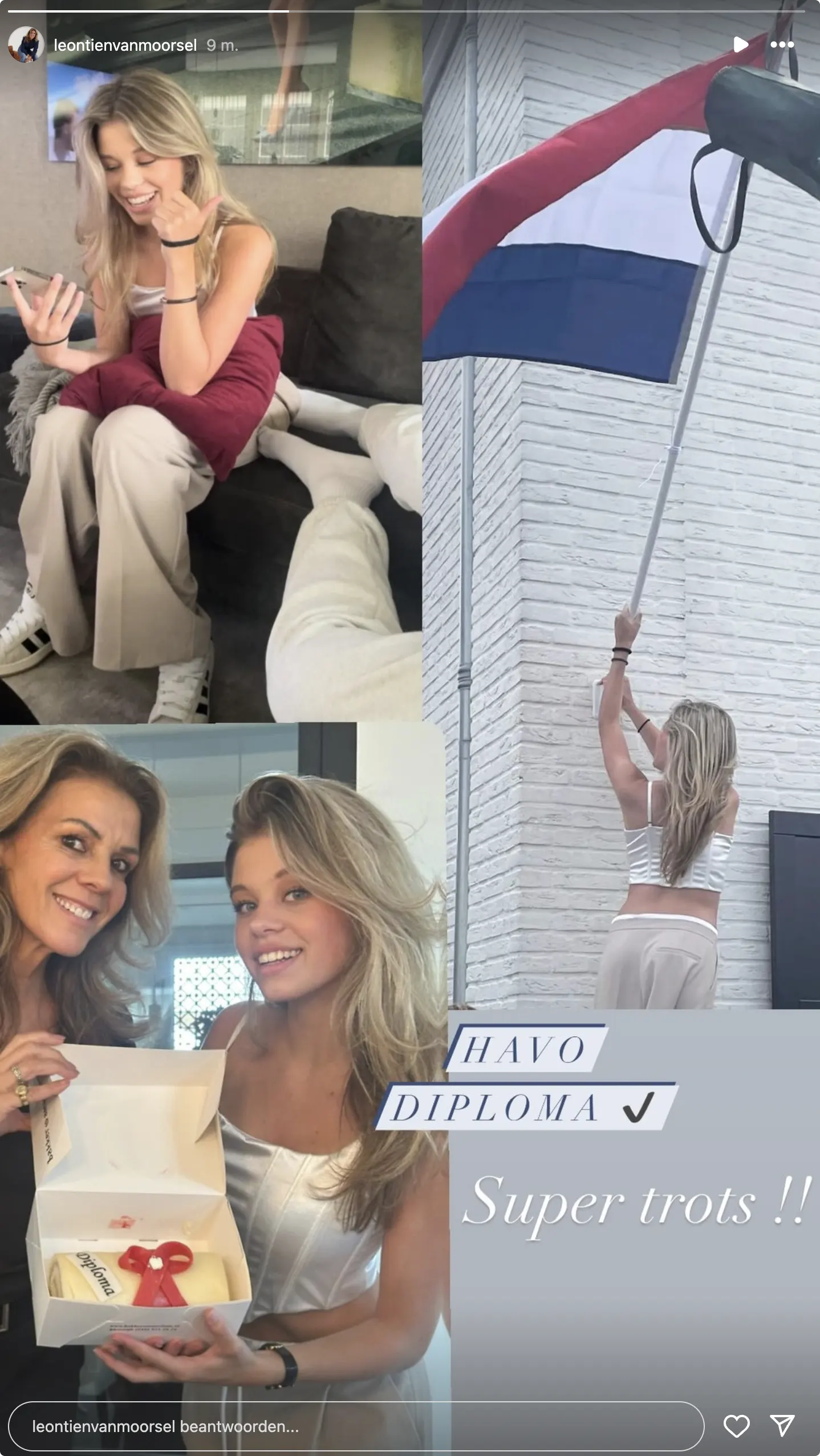 De dochter van Shownieuws-deskundige Leontien van Moorsel is ook geslaagd. Leontien schrijft bij een aantal foto's op haar Instagram-story: "Havo-diploma. Super trots!"