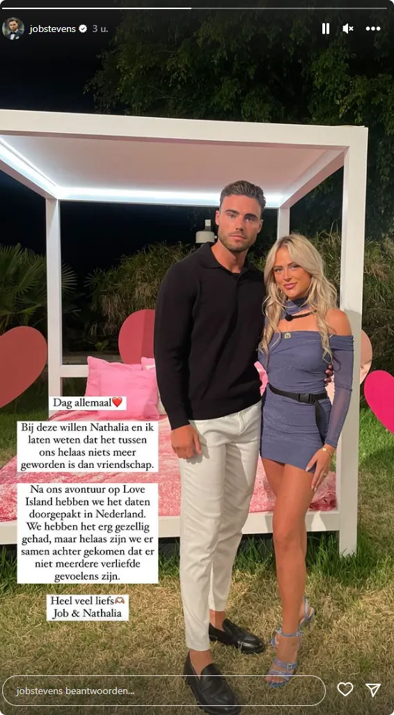 Zo schrijft Job maandag op Instagram: “Bij deze willen Nathalia en ik laten weten dat het tussen ons helaas niets meer geworden is dan vriendschap. Na ons avontuur op Love Island hebben we het daten doorgepakt in Nederland. We hebben het erg gezellig gehad, maar helaas zijn we er samen achter gekomen dat er niet meerdere verliefde gevoelens zijn. Heel veel liefs, Job en Nathalia.”