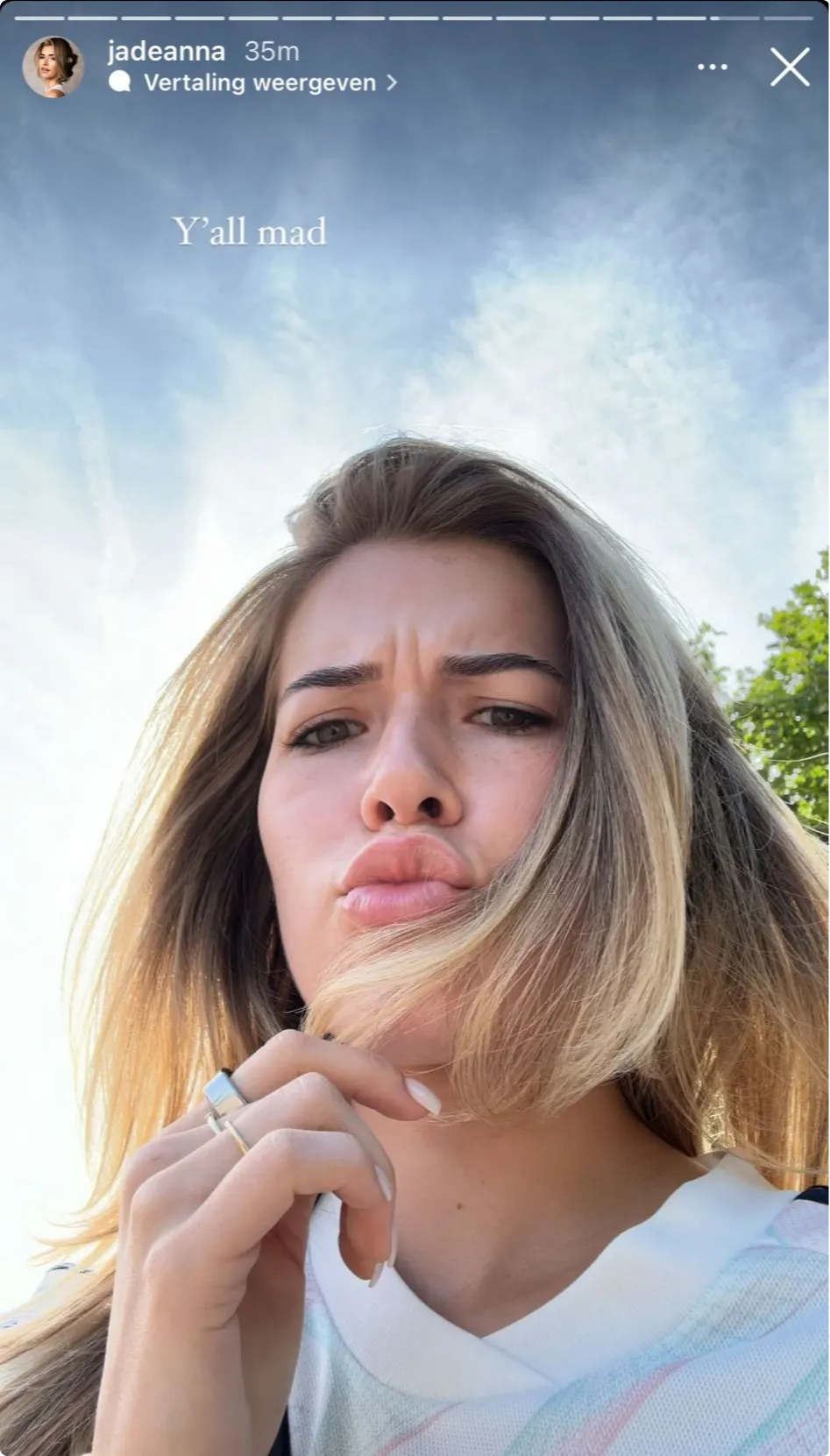 De influencer krijgt hier namelijk veel reacties op, want in haar volgende Instagram-story plaatst Jade een boze foto met de tekst: "Jullie zijn allemaal boos."