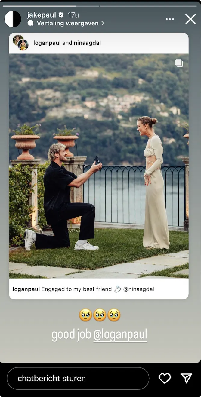 De vele reacties van zijn volgers die Jake Paul oproepen tot een huwelijksaanzoek kwam tot stand nadat Logan Paul, de broer van Jake zijn Deense vriendin Nina Agdal ten huwelijk vroeg. Op Instagram reageert Jake Paul vol lof op het huwelijksaanzoek van zijn broer, zo schrijft hij bij de foto 'Goed werk', wat bij zijn volgers niet ongezien bleef.