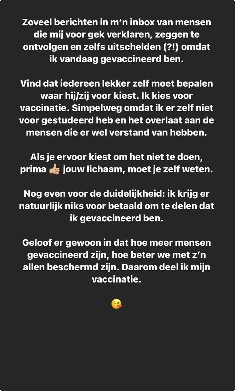 Daarna stroomde haar inbox vol met haatberichten, laat ze in de avond weten op Instagram. "Zoveel berichten in m'n inbox van mensen die mij voor gek verklaren, zeggen te ontvolgen en zelfs uitschelden (?!) omdat ik vandaag gevaccineerd ben", schrijft Sterk. Dat mensen zich zo met haar bemoeien heeft ze weinig begrip voor. "Vind dat iedereen lekker zelf moet bepalen waar hij/zij voor kiest."