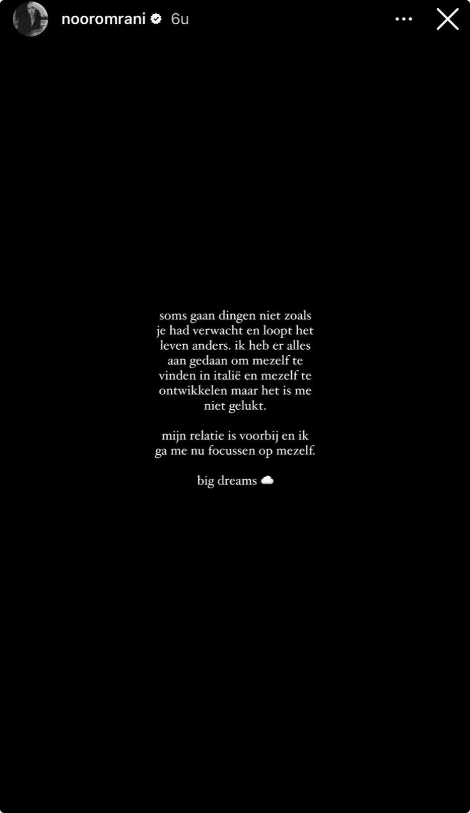Noor verhuisde vorig jaar met Marcus naar Italië omdat hij voor de Italiaanse voetbalclub Sassuolo ging spelen. Zij ging met hem mee. Dat maakte ze ook bekend op haar Instagram. "Het is niet makkelijk om dit allemaal achter te laten maar voor de liefde doe ik alles. Het is nu tijd voor een nieuw avontuur in Italië", schreef ze destijds.