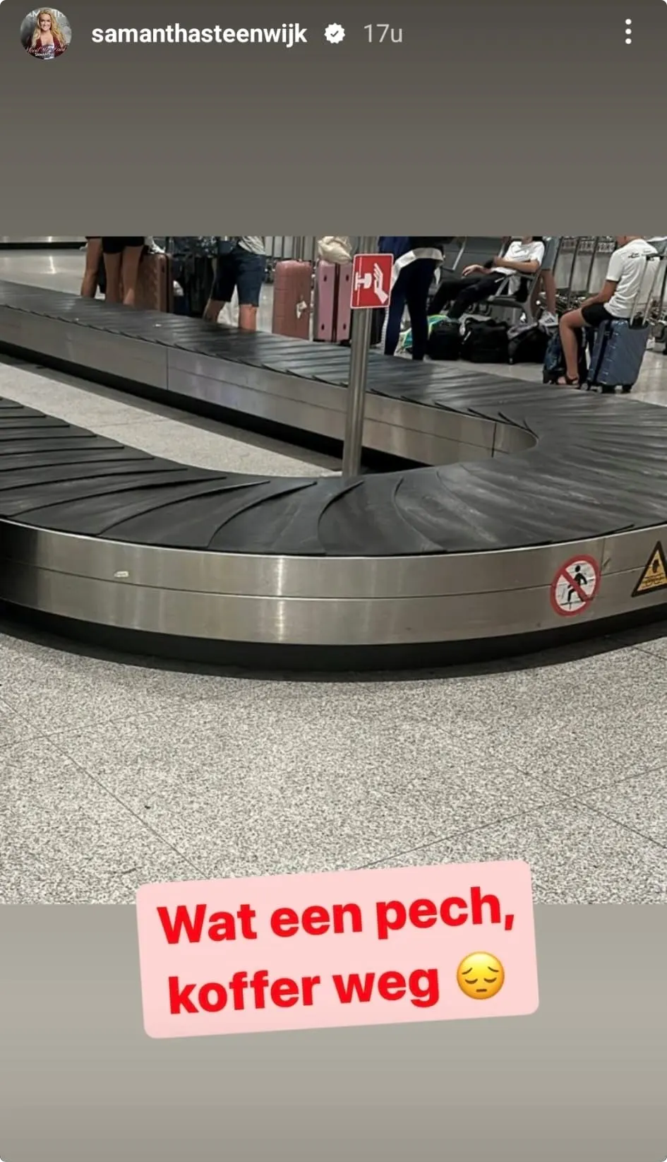 "Wat een pech, koffer weg", zo schrijft Samantha in haar Instagram Stories met een verdrietige emoji erachter. Ze deelt er een foto een lege kofferband op het vloegveld bij. Of ze inmiddels haar koffer weer heeft, heeft ze nog niet gedeeld.