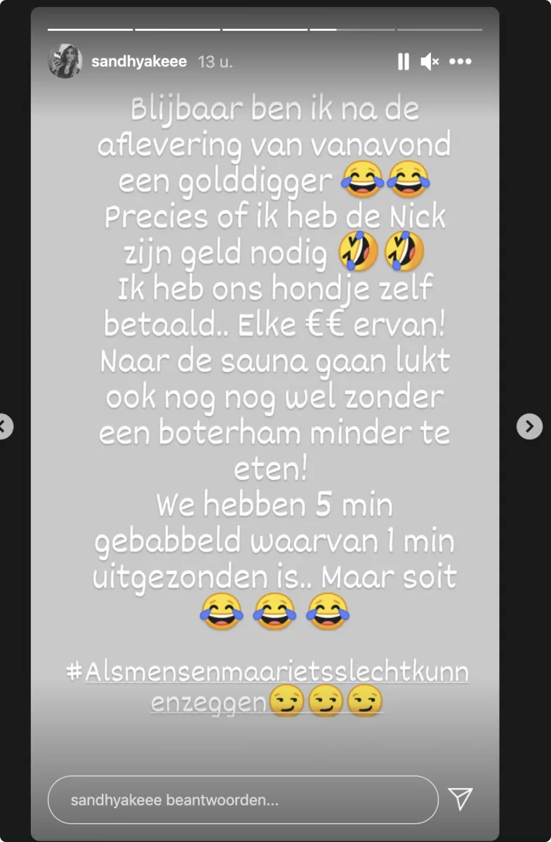 Sandhya was kort in het programma te zien. Ze liet hun nieuwe hondje Fendi zien aan Nick, die hem zal opwachten bij terugkomst uit het Big Brother-huis. Gek genoeg lijken veel mensen het mooie fragment niet te kunnen waarderen. "Blijkbaar ben ik na de aflevering van vanavond een golddigger", schrijft Sandhya op Instagram. "Precies of ik heb Nick zijn geld nodig..."