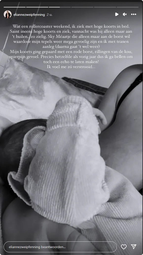 "Wat een rollercoaster weekend.", begint de vriendin van Thomas haar verhaal. Ze laat weten dat ze met hoge koorts ziek op bed lag samen met haar zoontje Saint. "En Sky, die alleen maar aan de borst wil waardoor mijn tepels weer mega gevoelig zijn en ik haar met tranen der aan leg".
