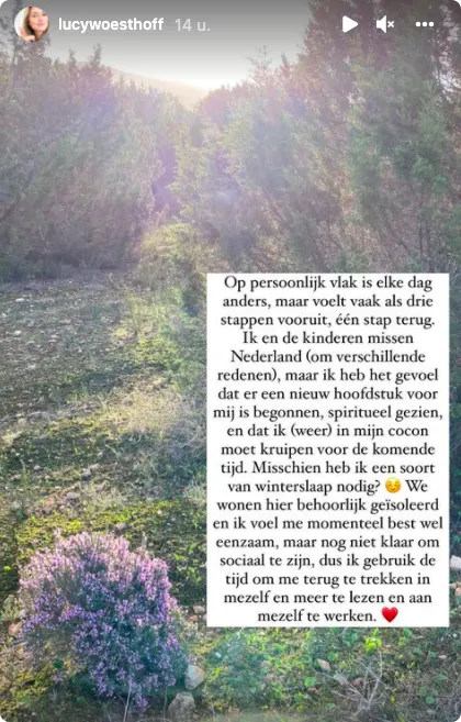 Lucy Woesthoff, de vrouw van zanger Dinand Woesthoff, laat via een Instagram Story weten dat zij Nederland ontzettend mist.