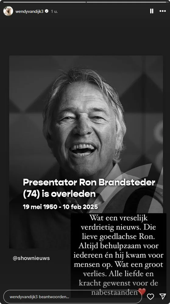 Wendy van Dijk noemt het overlijden van Ron Brandsteder 'een groot verlies'. In een bericht op Instagram herdenkt de presentatrice de tv-presentator als 'die lieve goedlachse Ron'.