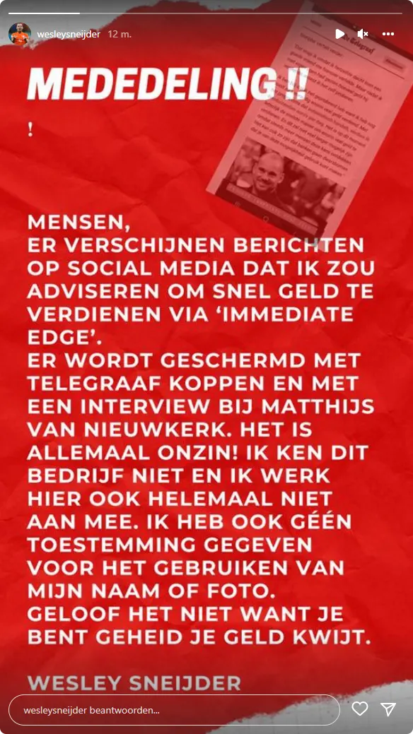 "Mensen, er verschijnen berichten op social media dat ik zou adviseren om snel geld te verdienen via 'immediate edge'", schrijft Wesley in zijn Instagram Stories. De tekst wordt zelfs weergegeven in Telegraaf-koppen. Dit blijkt dus niet te kloppen. "Ik ken dit bedrijf niet en ik werk hier ook helemaal niet aan mee."