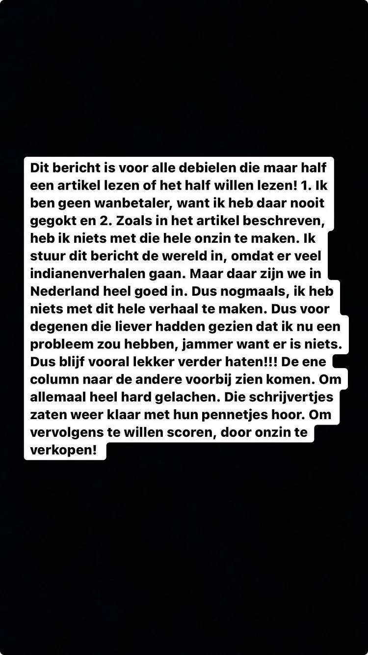 Zo schrijft hij in onderstaand bericht: "1. Ik ben geen wanbetaler, want ik heb daar nooit gegokt. 2. Zoals in het artikel beschreven, heb ik niets met die hele onzin te maken. Ik stuur dit bericht de wereld in, omdat er veel indianenverhalen gaan. Maar daar zijn we in Nederland heel goed in."
