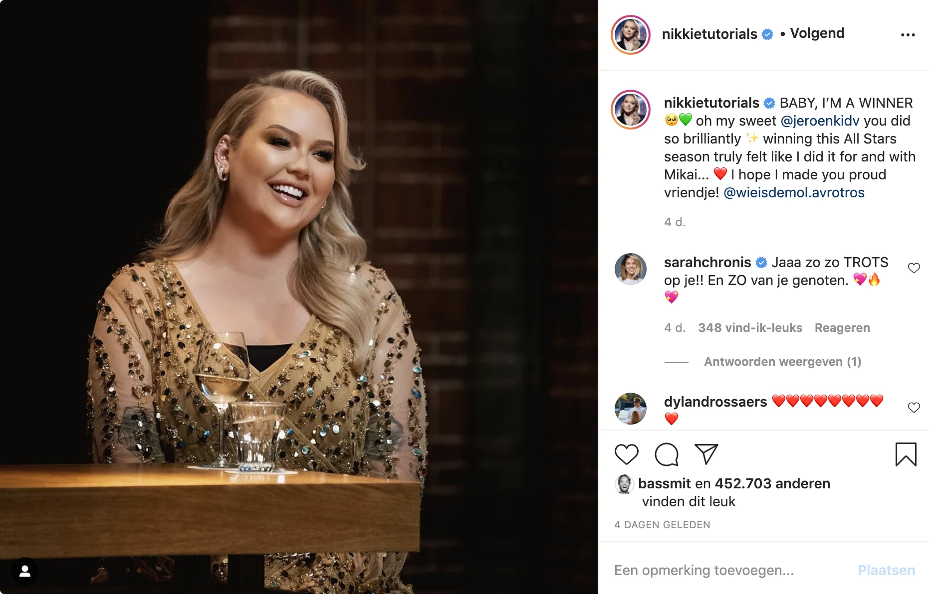 Nikkie maakte zaterdag tijdens de finale-uitzending bekend dat ze haar prijzengeld van 12.580 euro zou doneren. De YouTuber deed dat ter nagedachtenis aan haar broertje Mikai die in mei 2018 overleed aan kanker. Destijds stopte Nikkie voortijdig met haar eerste deelname aan Wie is de Mol? vanwege zijn ziekbed.