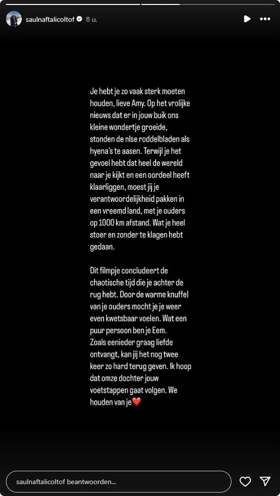 "Je hebt je zo sterk moeten houden, lieve Amy", begint Saul zijn Instagram-verhaal. "Op het vrolijke nieuws dat er in jouw buik ons kleine wondertje groeide, stonden de Nederlandse roddelbladen als hyena's te azen."