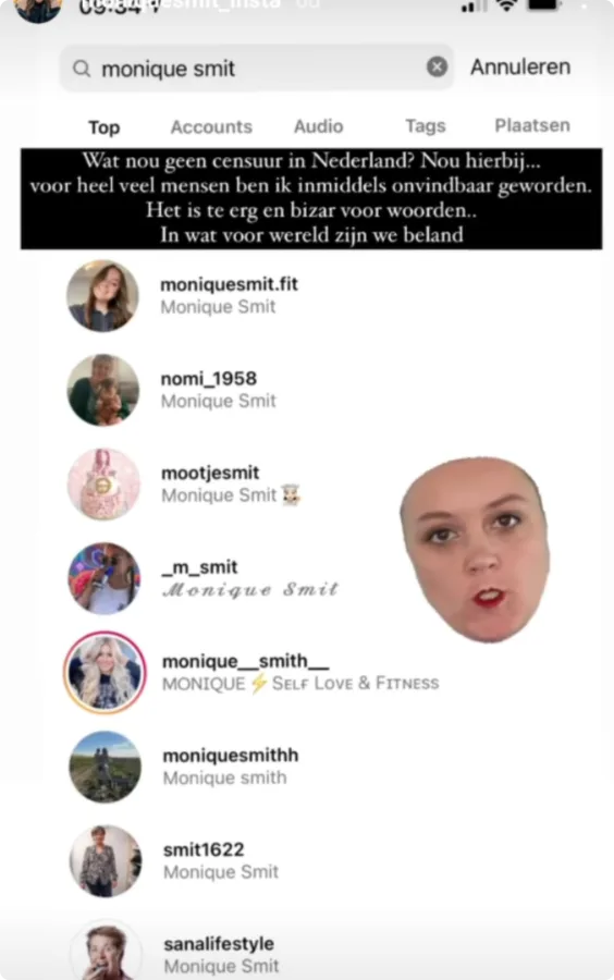 "Wat nou geen censuur in Nederland?" schrijft ze op het door haar zo gehate medium. "Nou hierbij... Voor heel veel mensen ben ik inmiddels onvindbaar geworden." Ze laat vervolgens zien dat als je Monique Smit intikt op Instagram, je heel veel Monique Smit's vindt, maar niet de bekende Volendammer.