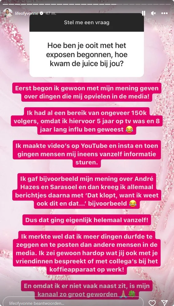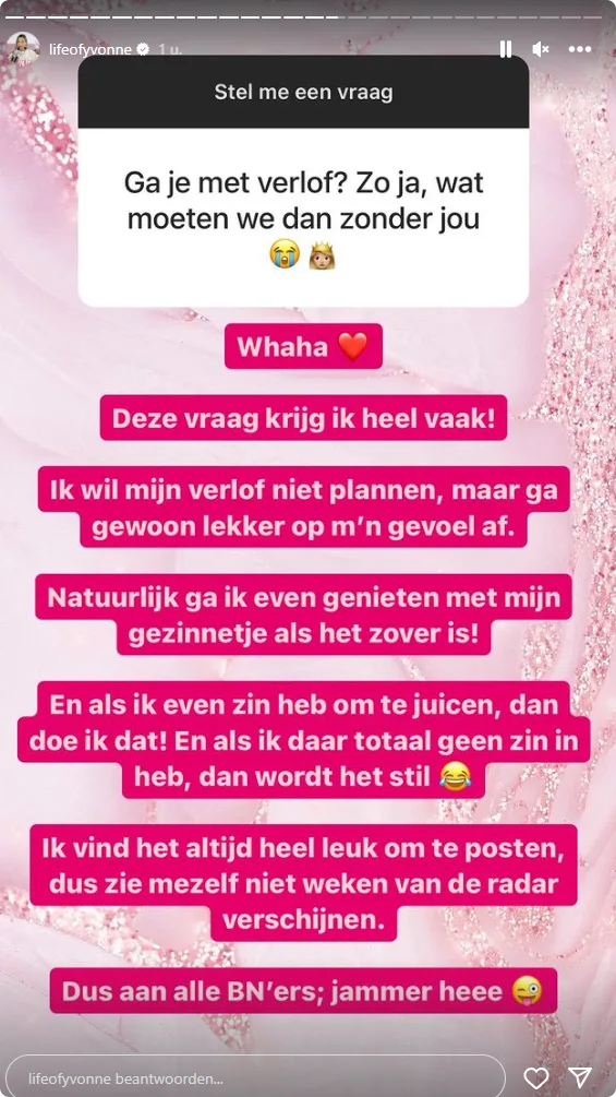Maar als Yvonne even zin heeft "om te juicen", dan doet ze dat. "En als ik daar totaal geen zin in heb, dan wordt het stil. Ik vind het altijd leuk om te posten, dus zie mezelf niet weken van de radar verdwijnen.