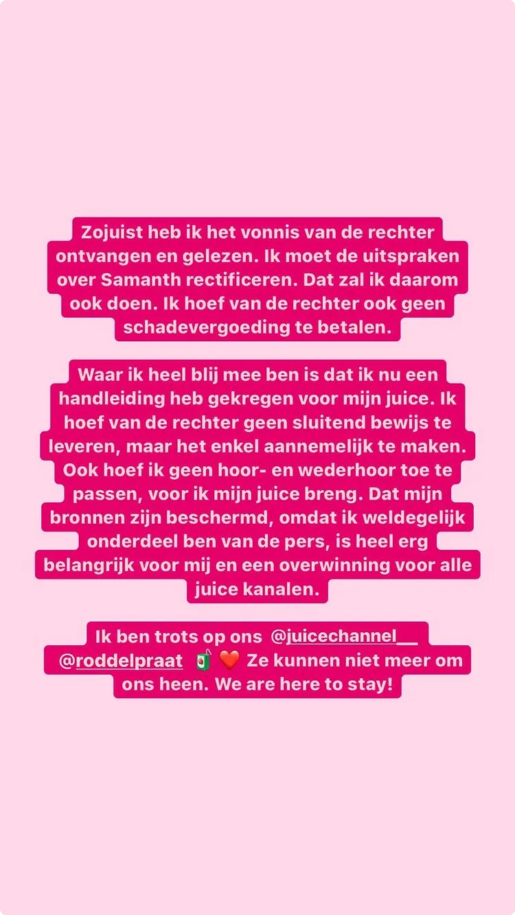 De eigenaresse van het juicekanaal moet van de rechter op zowel Instagram als in haar eerstvolgende video op YouTube een vooraf opgestelde rectificatie doen. Doet zij dit niet binnen de gestelde termijn na de uitspraak, dan volgt er een dwangsom van 1.000 euro per dag.
