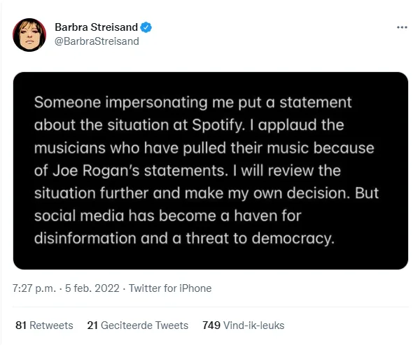Eerder deed iemand zich als Streisand voor op sociale media, begint de 'echte' Streisand haar verhaal, en deelde het bericht over "de Spotify-situatie". Hoewel de artiest haar muziek (nog) niet laat verwijderen, zegt Streisand dat zij "klapt voor de artiesten die dit hebben gedaan vanwege de uitlatingen van Joe Rogan".