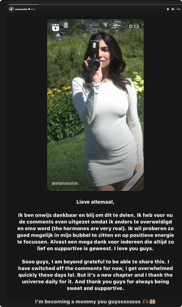 In haar Instagram Stories laat ze weten dat ze ontzettend blij is om dit leuke babynieuws te delen en dat ze gaat genieten van haar babybubbel. Wel zegt ze dat ze de reacties heeft uitgezet.