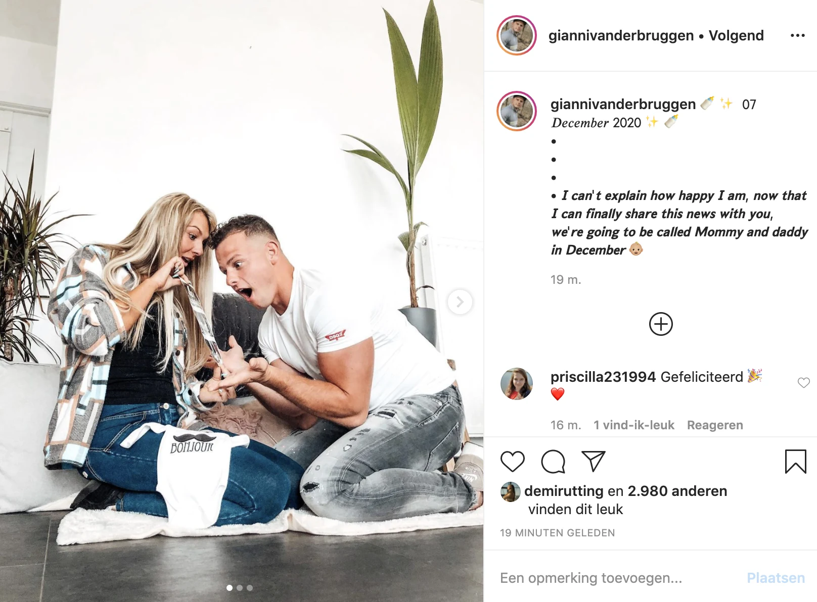 Bij onderstaande foto schrijft Gianni: "Ik kan niet uitleggen hoe blij ik ben dat ik eindelijk het nieuws met jullie kan delen. Wij worden vader en moeder in december!" Veel volgers reageren dolblij op het nieuws en feliciteren het stel.